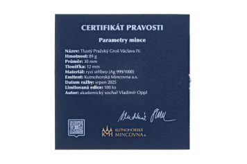 Jedním z jejích významných počinů společnosti je mimořádná emise Tlustého Pražského Groše Václava IV., připravená k výročí 725 let od počátku kutnohorské ražby. Tato unikátní pamětní mince z ryzího stříbra Ag 999,9 váží 89 gramů, má průměr 30 milimetrů a tloušťku 12 milimetrů – což z ní činí skutečně „tlustý“ kus kovu, který nelze přehlédnout. Zvláštní pozornost si zaslouží i balení Groše. V luxusní krabičce najdete nejen minci a certifikát pravosti, ale i rukavice, které slouží k manipulaci s mincí.